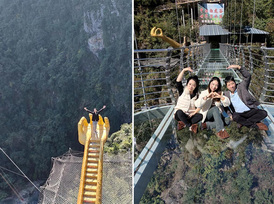 爬到山顶,一只巨大的“金手掌”悬崖壁之上,吸引大家争先体验,站在掌中随意的舒展自己,暂时忘却工作,把自己和大自然紧紧的融合在一起。“金手掌”旁边是垂直高度230米的玻璃鹊桥,桥面通体透明,行走其上,举步惊心。感受到团队积极主动的气氛,一些胆小的同事受到了鼓舞,勇敢的走上玻璃桥,体验了一次踏虚凌空的畅快刺激。
